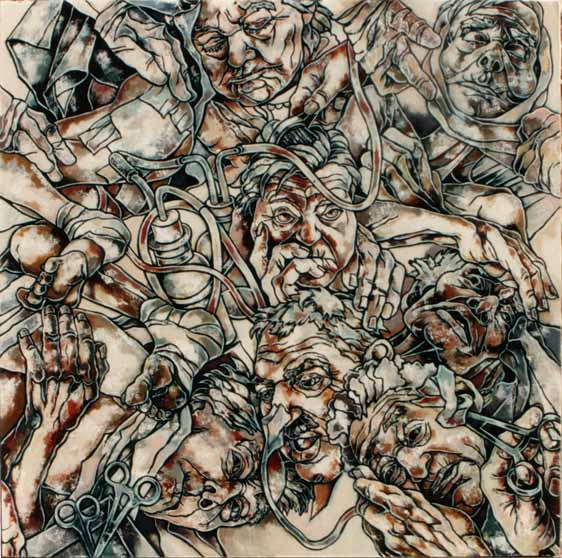 techniques mixtes sur toile tendue sur poutres.