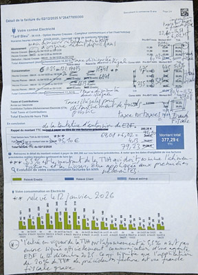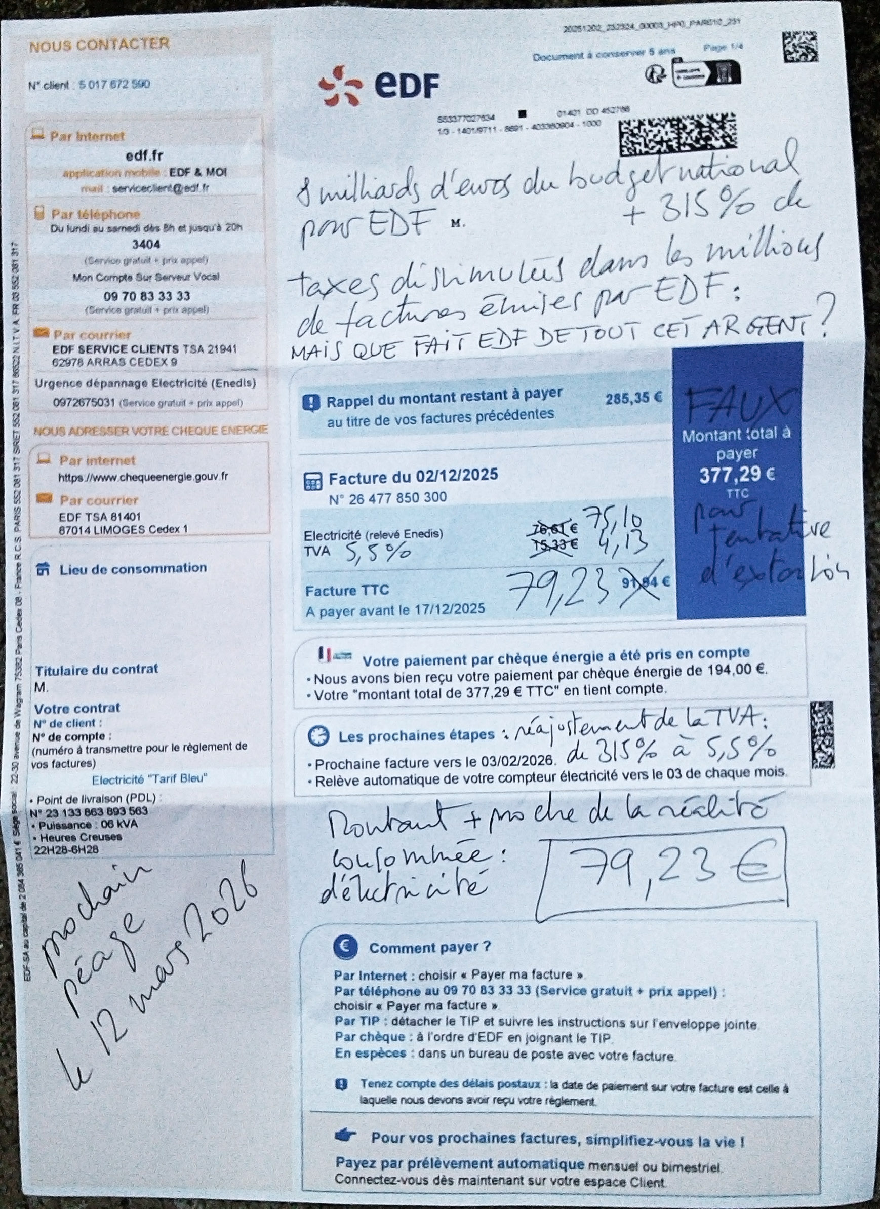 La consommation d'électricité dans ce pays est taxée + cher que le tabac ! L'alimentation et les livres, considérés vitaux sont taxés à 5,5%. L'énergie électrique, vitale, devrait donc aussi être taxée à 5,5% et non à 315%. Surtout que les agentes de EDF expliquent ces taxes sans savoir leur réelle destination. Ce qui fait de tous les agents EDF les complices des détournements de fonds public, les complices des menaces et les complices des extorsions envers les particuliers consommateurs. C'est pour cette raison que tous les courriers adressés aux particuliers sont anonymes (sic). Mais l'anonymat n'innocente pas les actions criminelles de EDF envers tous les consommateurs. N'est-ce pas le moment de mûrir EDF ! Celles et ceux qui se cachant derrière le logo ! pour que la nuisance nationale de EDF cesse de régner dans nos familles et nos sociétés ?