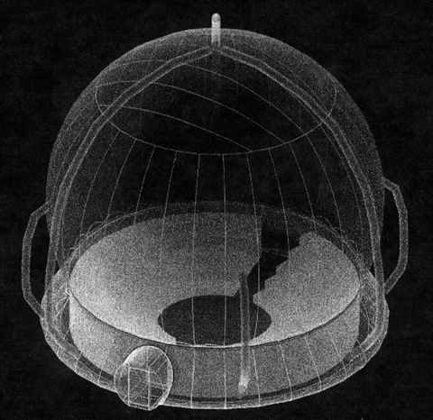 Première maquette 3D de la SkySphere avec ses relocalisateurs sonores dont ceux à la cime ne sont pas disposés au bon endroit. Maquette réalisée par l'ingénieur Pierre Jutras. La disposition du public en « gradins de cirque » n'est pas non plus adaptée au contexte d'un concert spatial dans un édifice sphérique. Cette esquisse pour montrer l'architecture sonique dans ses prémices.