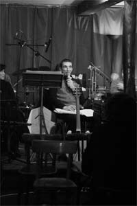 The unperforming orchestra on stage, with explanation of why today's original music is censored in France.