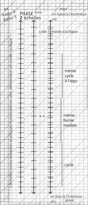À mélanger/superposer 2 échelles il se produit le phénomène bien connu : celui du déphasage. Bien connu pour le rythme, à commencer avec le 3 pour 2 (triolet sur duolet). Le déphasage scalaire entre 2 échelles, ou +, génère un grand nombre d'intervalles non inclus dans les 2 échelles accouplées qui se déphasent. Le déphasage est une voie de génération scalaire encore inexplorée qui peut donner un sens supplémentaire à l'harmonie polyscalaire (il y en a d'autres) pour le cheminement de ses accords. [Dans le monde octaviant de l'échelle de 12 1/2 tons, la raison fondatrice de l'harmonie repose sur les cadences harmoniques].