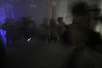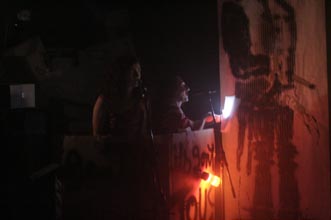 La musique (son mono étriqué) et la projection vidéo sur la porte d'entrée commence 30mn avant l'ouverture des portes pour pénétrer dans la zone des Rescapés de l'hégémonie culturelle. (dans l'antichambre le public prend son billet et attend l'heure d'ouverture des portes de la zone)
