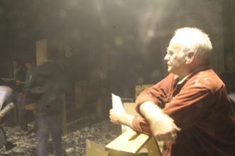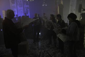 (Le public après avoir payé sa place et été étiqueté en fonction de sa classe sociale, pénètre la zone des Rescapés, une cité complexe de cartons avec les personnages géants de Nato. le temps que tous y pénètrent une voix robotique harmonisée les prévient de leur décision)