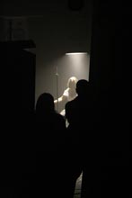 VOIX ARTIFICIELLE MALE AUX YEUX ET BOUCHE SANS VISAGE – (au bout de 30mn de la mélodie répété « ils sont tous gentils » à la harpe solo) Public, public, public, vous pouvez maintenant entrer (les portes de la zone des Rescapés s'ouvrent et le public ne peut que pénétrer un par un)